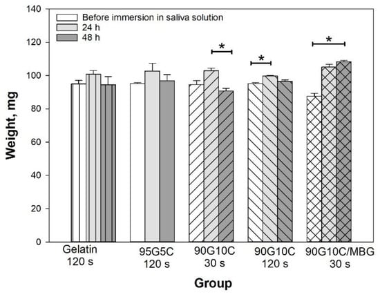 Effect of composition on hydrated gel weight. The gel samples, including pure gelatin, 95G5C, 90G10C and 90G10C containing 20% MBG, which were irradiated for a designated time, were immersed in a pH 7 artificial saliva solution, and weighted every 24 h. Data are presented as the mean ± SD (n = 9) and were analyzed using the nonparametric Kruskal–Wallis H-test. Differences of p < 0.05 were considered statistically significant. (*) denotes a significant difference (p < 0.05).