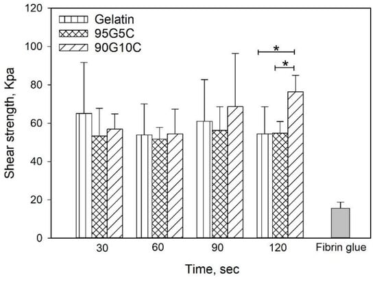 To investigate the adhesive strength, we used fibrin glue as a control, as shown in Figure 5, and regardless of the composition and exposure time, the shear strength of all gels was significantly higher compared to the value obtained for fibrin glue. However, there was no significant difference among samples with different compositions exposed for 30, 60 and 90 s. However, the 90G10C sample irradiated for 120 s displayed a higher shear strength compared to samples with other compositions. In addition, only the shear strength of 90G10C slightly increased with exposure time.