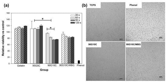 The method of MBG fabrication has previously been described []. Briefly, Pluronic P 123 (2.0 g) in HCl (0.5 N, 0.5 mL) was mixed with tetraethoxysilane (TEOS, 3.7 g), calcium nitrate tetrahydrate (0.49 g), and triethylphosphate (TEP, 0.34 g) at 300 rpm for 3 h. Subsequently, the MBG precursor solution was poured into a dish and kept in the hood until the solvent had completely vaporized. The collected samples were calcined at 700 °C for 3 h to eliminate the organic components and obtain the MBG. Type B gelatin and type I collagen fibrils (Victory Biotech Co., Ltd., Foshan City, China) were dissolved in phosphate-buffered saline (PBS) to obtain a 100 mg/ml solution, whereas gelatin/collagen mixtures were prepared with weight percentages of 90/10 (90G10G) and 95/5 (95G5C). Furthermore, MBG was then added and mixed well with the gelatin and collagen mixture to a content ranging from 10 to 30% (w/w). [Ru(II)bpy3]2+ chloride and sodium persulfate (SPS) were then added to the mixture to a final concentration of 1 and 20 mM, respectively. The mixture was transferred to a Teflon mold and irradiated for 30, 60, 90 and 120 s at room temperature with a dental LED curing light (LiteQ LD-107, MONITEX™, Fomed Biotech Inc., New Taipei City, Taiwan) from a distance of 1 cm. All chemicals used were purchased from Sigma-Aldrich Chemical Company (St. Louis, MO, USA) and were reagent grade unless otherwise stated.
