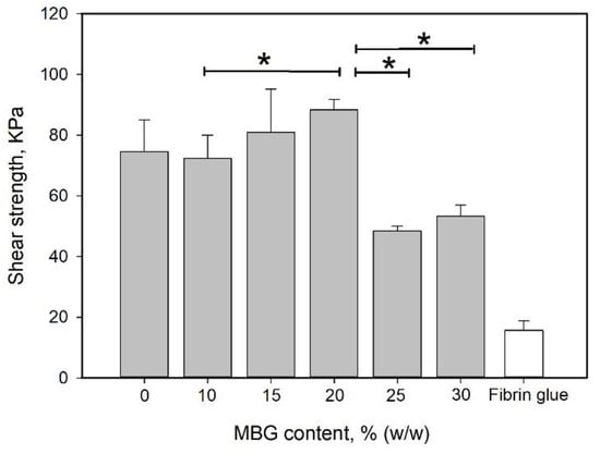 Effect of MBG content on shear strength. MBG was added to and mixed well with the 90G10C solution to a content ranging from 10 to 30% (w/w). Then, 100 μL of the mixed solution was applied to the porcine skin strips. The 1 cm2 overlap area was irradiated by an LED curing light for 120 s. Data are presented as the mean ± SD (n = 9) and were analyzed using the nonparametric Kruskal–Wallis H-test. Differences of p < 0.05 were considered statistically significant. (*) denotes a significant difference (p < 0.05).