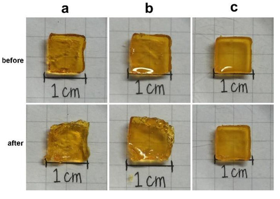 Images of sample used in the compressive test. The gel samples, (a) gelatin, (b) gelatin containing 20% mesoporous bioactive glass (MBG), and (c) 90G10C containing 20% MBG, were irradiated by an LED curing light for 120 s (before) and then were placed on the stage of the material testing system machine (MTS) under compressive test (after).