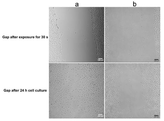 Images of fibroblast cells crossing a gel-covered area. A straight linear gap was created in a confluent L929 cell monolayer. The aqueous composite was placed within the gap area and irradiated for 30 s. Then cell migration was observed with (a) 90G10C containing 20% MBG gel, and (b) blank used as control.