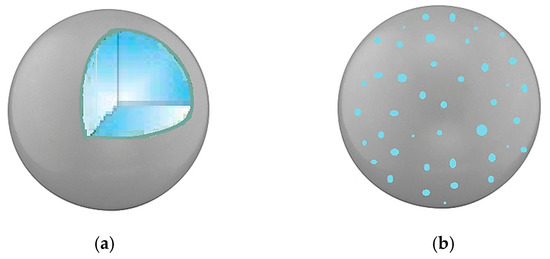 The production of microparticles and nanoparticles offers unique benefits in drug delivery. Size reduction is a common approach to overcome the problems related to poor solubility in water of many active ingredients, such as low oral bioavailability, irregular absorption, and side effects caused by drug overdose. The drug dissolution rate can be enhanced by its micronization since the particle size reduction leads to an increase in the specific surface area and a higher contact between the drug molecules and the dissolution medium [37]. However, this route does not allow stabilizing the pharmaceutical formulations. For this purpose, several hydrophilic polymers were used as carriers to obtain polymer/drug particles. Among these, PVP is one of the most commonly used for the attainment of composite particles [2,19,38,39,40,41,42,43,44,45]. The presence of PVP allows the delay of the crystallization of the active principle contained in the particles and the increase of its dissolution rate in aqueous media. Moreover, PVP is used as a masking agent for odors/flavors, as well as a stabilizing or protective agent for the active compound, avoiding its oxidation and deactivation. PVP was widely used to obtain both microcapsules [19,40] and microspheres [2,21,39,42,46,47,48,49,50,51,52,53,54,55,56]. A core–shell structure characterizes the microcapsules (Figure 1a); generally, the core material contains the active compound, whereas the wall material consists of the polymeric carrier (PVP or blends). Differently, a microsphere (Figure 1b) consists of a matrix (PVP or polymeric blends) in which the drug is homogeneously dispersed. In some papers, composite nanoparticles were also produced by using PVP as the carrier [17,57].