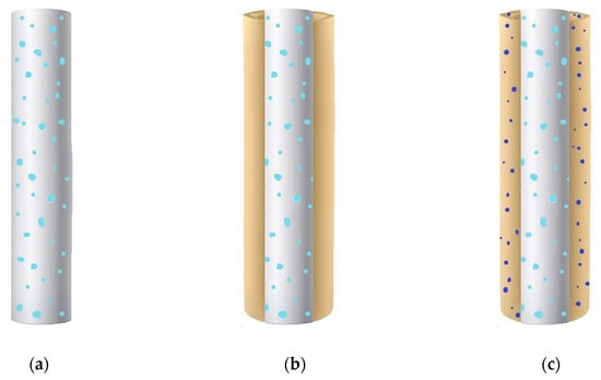 A sketch of different drug-loaded fibers that can be obtained by using PVP is reported in Figure 2. The active principle can be dispersed into the polymeric matrix, consisting of PVP or blends, as shown in Figure 2a. Instead, in the case of core–shell fibers, the drug can be dispersed only into the core material (Figure 2b) or both into the core and the shell (Figure 2c); in the latter option, the same active principle or even a different one can be loaded in the sheath. The main results obtained in the papers focused on the production of PVP-based fibers are summarized in Table 2; the employed technique, the polymeric carriers, and the incorporated active compounds are specified.