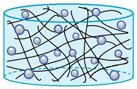 In Figure 3, a sketch of drug-loaded hydrogels is reported, showing the molecule of active principle dispersed in the network (PVP or polymeric blends).