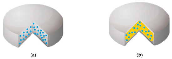 Polymeric tablets are matrices with great potential for oral controlled drug delivery, in addition to having rather low manufacturing cost [133]. There are two different kinds of tablets, namely monolithic matrix systems (Figure 4a) and osmotic systems (Figure 4b). In the former (Figure 4a), the drug is dispersed in the polymeric matrix, which can be predominantly hydrophobic or hydrophilic [133]. Instead, in the latter, the osmotic systems consist of a core tablet surrounded by a semipermeable coating, sketched with a different color in Figure 4b. The inner core usually contains the active principle, thus called the active layer, and the external barrier layer contains the osmotic agent. The release of the active compound from the polymer matrix will be strongly influenced by the type of tablet. Indeed, the drug release from the oral tablets can occur through different mechanisms, depending on whether they are erodible matrix (size reduction) or swellable matrix (increase in tablet volume and drug diffusion) [133].