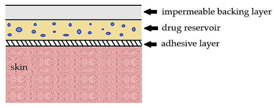 In Figure 5, a sketch of a medicated patch obtained using PVP is reported. It can consist of an adhesive layer, a drug reservoir, i.e., the drug dispersed in a polymeric film (PVP or blends), and a backing layer (generally based on hydrophobic polymers), which may be present or absent.
