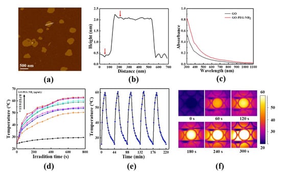 Characterization and photothermal performance of GO-PEG-NH2. (a) AFM image of GO-PEG-NH2 deposited on a mica substrate. (b) The height profile of the AFM image. The red arrows indicate the height difference. (c) UV-vis-NIR absorption spectrum of GO and GO-PEG-NH2. (d) Temperature distribution of pure water and different concentrations of GO-PEG-NH2 aqueous solution under 808 nm laser irradiation. Different concentrations of GO-PEG-NH2 are distinguished by colored lines. (e) Photothermal conversion cycling test of GO-PEG-NH2 aqueous solution under five cycles of 808 nm laser irradiation (1.5 W/cm2). (f) Infrared thermal image of GO-PEG-NH2 aqueous solution (50 μg/mL) under 808 nm laser irradiation.