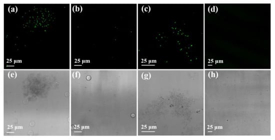 Confocal laser scanning microscopy (CLSM) was used to directly visualize the selective association of GO-PEG-NH2 in a mixture of live cells and bacteria to verify that GO-PEG-NH2 could selectively target bacteria over mammalian cells. Gram-positive bacteria (Staphylococcus aureus) and Gram-negative bacteria (Escherichia coli) were used as representative strains in order to verify the selective association of GO-PEG-NH2 with bacteria. At the same time, the suspension of CCRF-CEM cells was selected for experimentation because it does not require trypsin digestion to avoid undesirable autofluorescence. Firstly, we used isopropyl-β-D-thiogalactoside (IPTG) to induce E. coli expression of EGFP as a marker to visualize the selective binding mechanism of GO-PEG-NH2, and when considering the excellent fluorescence properties of enhanced green fluorescent protein (EGFP). When compared with other markers, EGFP has the advantages of small molecular weight, non-toxic effect in bacterial and eukaryotic cells, and stable fluorescence. Secondly, CLSM images of IPTG-induced E. coli and CCRF-CEM cells blended with GO-PEG-NH2 treatment were obtained to validate our strategy. In subsequent experiments, E. coli and CCRF-CEM cells were mixed and incubated with GO-PEG-NH2 at 37 °C for 30 min. The results showed that the bacteria were attached to GO-PEG-NH2, while most of the cells were still in a freely dispersed state (Figure 2a,e). It should be pointed out that a small number of cells were also adsorbed by GO-PEG-NH2. The probable reason is that part of the apoptosis exposes the phosphatidylserine (PS) in the inner leaflets of the plasma membrane, resulting in a large increase in the negative charge density on the cell membrane surface. After additional 30 min. incubation, the fluorescent image of the supernatant showed that only a small amount of bacteria was present and the cells were normally dispersed in the solution (Figure 2b,f).