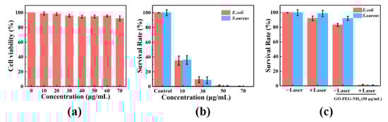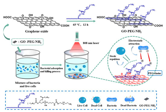 In this work, we designed a DSPE-PEG-NH2 (one end of DSPE-PEG-NH2 is a hydrophobic structure 1,2-distearoyl-sn-glycero-3-phosphoethanolamine, and the other end is an amino-terminated PEG chain) modified GO composite (GO-PEG-NH2) [50,51,52]. The cell wall of bacteria is mainly made of peptidoglycan and acid polysaccharide, which exhibits a large amount of net negative charges on the membrane surface. Under physiological conditions, mammalian cell membranes are nearly neutral with only a small quantity of negative charge. Therefore, the amino group of GO-PEG-NH2 can be bound to a negatively charged bacterial membrane by electrostatic driving forces, and the presence of a PEG chain can also reduce the non-specific adsorption of cell surface proteins. The flexibility of the main polyether chain is responsible for these properties in this process [16,53]. At the same time, as a photothermal conversion material, GO can thermally ablate bacteria that are adsorbed on the surface of GO-PEG-NH2 composite under 808 nm laser irradiation.