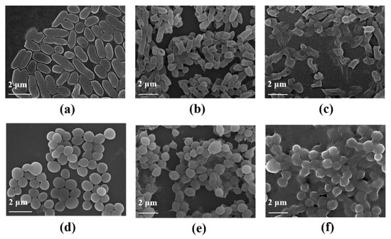 Field-emission SEM was used to observe the morphological changes of bacteria in order to visually understand the damage of GO-PEG-NH2 to bacteria before and after 808 nm laser irradiation. For S. aureus and E. coli, a control group without GO-PEG-NH2, the bacteria were intact, the surface was smooth, and the edges were visible (Figure 4a,d). When GO-PEG-NH2 was added under the dark, the bacteria undergo a certain degree of agglomeration, and the surface of the bacterial membrane was damaged and collapsed (Figure 4b,e). This is consistent with the views stated above. After the 808 nm laser irradiation, the bacterial membrane was completely broken and the membrane was fused (Figure 4c,f). The direct information from SEM images clearly shows the damage caused by GO-PEG-NH2 on bacterial membrane under both dark and 808 nm laser irradiation.