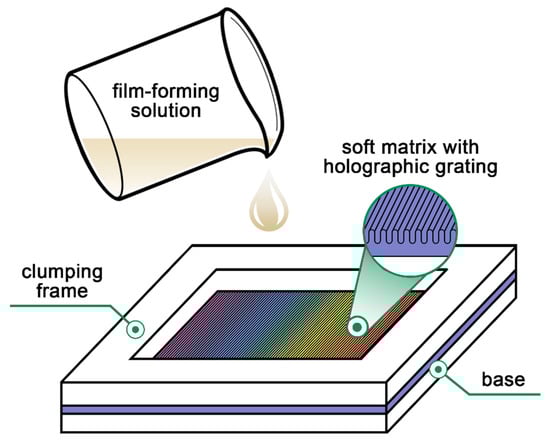 To prepare a thin coating with a holographic marker, a nanoimprint technique, such as soft lithography, was used. For this, the special molds were created for casting the film-forming solution. These molds consist of a base with a soft matrix mounted thereon and a clamping frame, which formed a container with dimensions of length x width x height 50 × 50 × 6 mm (Figure 1). The soft matrices were made from a silicone rubber as a submaster replica of a master metal diffraction grating with sinusoidal profile at the groove density of G = 600 grooves/mm. For this, the liquid silicone was poured onto the master grating and degassed in a vacuum chamber, followed by solidification under room conditions.