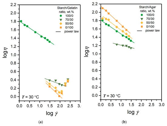 To understand the consistency of the film-forming solution during its molding by wet methods, such as casting or spraying of the solution with different shear rates, their dynamic viscosity was measured. Figure 2 shows the flow curves of the potato starch, gelatin, agar, solutions and their blends at a temperature of 30 °C in logarithmic coordinates. Despite the obvious differences in the represented flow curves at the different range of shear rate, which is a drawback of the Brookfield rotational viscometry method for highly diluted solutions, pronounced effects are observed that will be considered.