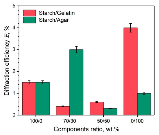 The results of the diffraction efficiency analysis of the holographic markers confirm the results of the visual analysis of their morphology. When comparing the results, it is seen that higher replication degree of the soft matrix microrelief by the film-forming solution, leads to the higher E value for the marker. In turn, it was previously considered that degree of grating replication depends not only on the consistency and flow indices of the film-forming solution, but also on its phase structure at the drying temperature. In one study [], a holographic marker based on albumin with the addition of a photosensitive salt ferric ammonium citrate at a thickness of 15 μm (two times more) had a value of E = 2.7%. The markers based on starch/agar blend at the ratio of 70/30 wt.%, as well as from the pure gelatin and starch, which demonstrates that the most isotropic grating grooves and a high degree of replication have the highest E values.