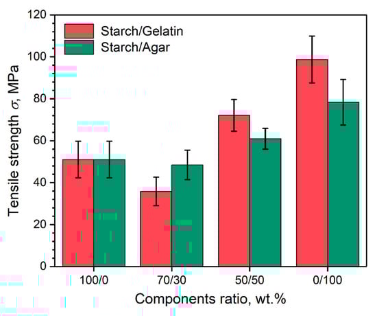 Mixing starch with water-soluble film-forming biopolymers with a stronger structure and less moisture sensitivity, such as agar or gelatin, will increase its properties. Agar, being a polysaccharide, has a starch-like structure and consists of a blend of galactose polymers, such as agarose and agaropectin, and is extracted from algae. Gelatin is basically a mixture of collagen polypeptides obtained by hydrolysis of animal waste. It was shown that starch-based films, with the addition of gelatins, showed an increase in tensile strength [,], elastic modulus [], water vapor permeability [,], solubility in water [] and oxygen permeability []. In turn, when agar was introduced into starch-based films, an increase in the glass transition and melting temperatures [], tensile strength [,,,], elastic modulus [] and water vapor permeability [] were also observed.