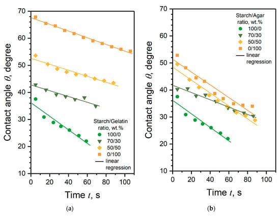 Dependences show that the θ value strongly depends on the coating composition. The graph in Figure 7a shows that the wettability of the coatings based on pure gelatin is on average two times lower than coatings based on pure starch. Coatings from the starch/gelatin blend also have greater hydrophobicity than starch coatings. The observed effect is caused by the increased sensitivity of starch to water compared with gelatin, due to the presence of a large number of hydroxyl groups in its structure. Identical behavior of the θ values was also observed for the pregelatinized starch/gelatin films, with the addition of camu-camu powder in the presence of sorbitol []. Coatings based on starch/agar blends (Figure 7b) have the lower of θ values compared to the starch/gelatin coatings, regardless of time. The agar-based coating, like starch, has high wettability, due to its polysaccharide structure. This effect was reported for cassava starch/agar/glycerol films [].