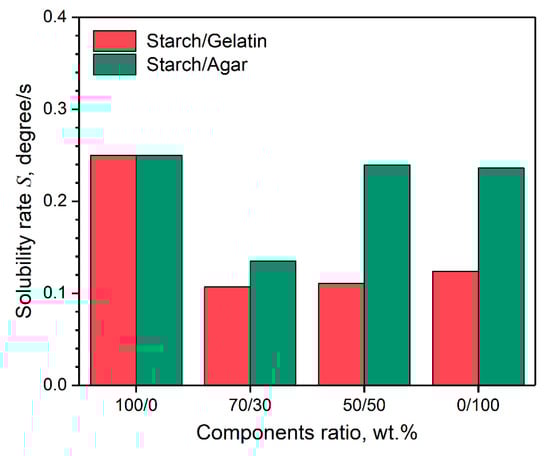 In the general sense, Figure 7 demonstrates that wettability of the coatings depends not only on their composition, but also on the time of water drop is on their surface. It was found that obtained coatings are not only hydrophilic but also water soluble. As a result, when the drop of water is located on the coating surface, a hole is formed over time. Therefore, the value of solubility rate S of the coatings was established using the fitting of the θ(t) dependencies by the linear regression equation . In this case, the b parameter of equation takes the physical meaning of the modulus of solubility rate gradient . The value of S parameter versus the coating composition are presented in Figure 8.