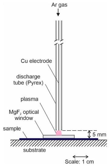 The system was kept at ambient conditions, i.e., air at atmospheric pressure, room temperature, and humidity of 60%. A single electrode was powered with a sinusoidal voltage source operating at a frequency of 25 kHz and a peak-to-peak voltage of 7 kV. Ar of purity 99.99% was introduced into the dielectric tube through a flow controller. The inner diameter of the dielectric tube was 3 mm. The electrode was a copper wire with a diameter of approximately 0.3 mm. The cross-section of the dielectric tube was therefore much larger than the cross-section of the Cu electrode. The Ar gas flow Φv was adjusted to 1 slm. The speed of gas at the exhaust of the dielectric tube was estimated from the cross-section of the tube and the gas flow as v = Φv/S, where S is the cross-section area of the discharge tube. Considering numerical values, i.e., Φv = 1 L/min, S = 7 mm2, the velocity of the gas at the exit of the dielectric tube is approximately 2 m/s. The velocity is high enough to prevent significant diffusion of surrounding air inside the Ar jet along the axis. The PS foil was placed on the substrate holder 5 mm below the exit of the dielectric tube. The substrate was made from a dielectric (wood) and placed far from any metallic element. The sample was therefore at a floating potential. Some experiments were performed by direct exposure of the polymer foil to APPJ plasma, whereas in other cases, we placed the MgF2 optical window on the polymer surface, as shown in Figure 1. The MgF2 window (from Crystal GmbH, Berlin, Germany) was in the form of a circular disk with a thickness of 2 mm and a diameter of 2 cm. The MgF2 window is transparent for a broad range of UV radiation down to approximately 115 nm [13]. The MgF2 optical window served as material transparent for UV/VUV radiation but prevented direct contact between charged or neutral species, which may abound in gaseous plasma.