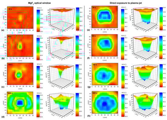 The right-hand column in Figure 2e–h shows a less pronounced evolution of the surface wettability with treatment time when no optical covering was used. Still, the area of the low water contact angle after 600 s of treatment (Figure 2h) is approximately double as compared to 30 s (Figure 2e). The results show that the minimum achievable contact angle of approximately 13° is obtained on the spot much larger than the jet diameter already after 30 s of plasma treatment. The prolonged treatment causes enlargement of the spot size, but the interface between non-treated and well-activated surface remains fairly unchanged. Such observation is typical for the evolution of any surface property where saturation occurs.