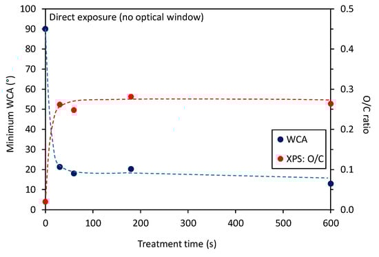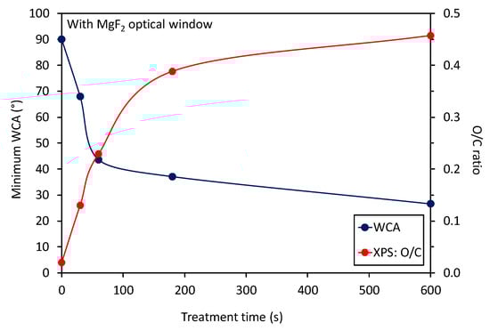 Variation of the minimum water contact angle and O/C ratio versus treatment time for the case when samples were covered with the optical window.