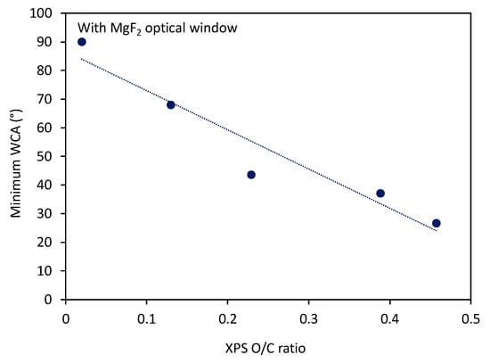 Correlation between the minimum water contact angle and O/C ratio for the case when samples were covered with the optical window.