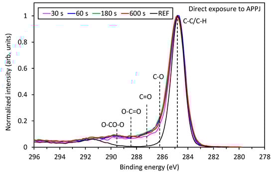 Different evolutions of XPS oxygen concentration shown in Table 1 and Table 2 are reflected in a different degree of surface functionalization of samples treated by VUV or by direct plasma treatment. The evolution of surface functional groups is revealed from the high-resolution C1s spectra of samples shown in Figure 6 and Figure 7. Figure 6 represents the high-resolution XPS spectra of samples treated by direct exposure to the plasma jet. The untreated sample shows only one peak at about 285 eV attributed to C–C/C–H. Another peak at 291.5 eV corresponds to the shake-up peak reflecting the aromatic character of this polymer. The high-resolution spectra were acquired for all treatment times. One can observe almost perfect overlapping of the curves. The result is expected, taking into account the saturation of the polymer surface as revealed from Table 2 and Figure 5, as well as Figure 2e–h. Interestingly enough, no specific functional group predominates on the surface of the samples treated directly by APPJ.