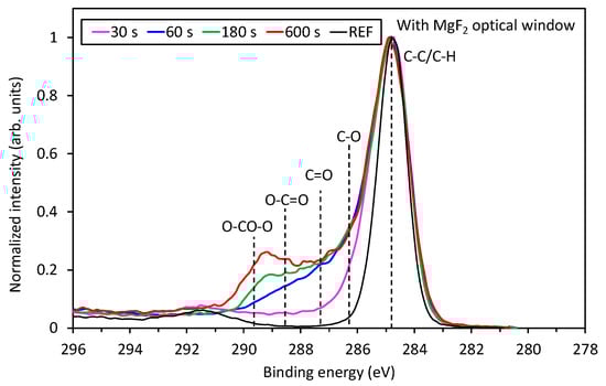 Comparison of high-resolution XPS C1s spectra of samples covered with MgF2 optical window and thus treated with VUV radiation for various treatment times.