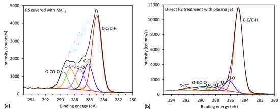 XPS C1s spectrum with subcomponents for PS treated for 10 min by: (a) VUV radiation and (b) by direct plasma jet.