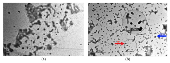 The polyacrylic emulsions obtained before and after graft copolymerization were observed using TEM. 7S globulin and 11S globulin are the dominant proteins in SPI. In TEM, SPI micelles are solid and spherical in shape [40]. As shown in Figure 3a, before the graft copolymerization, the latex particle diameter of the polyacrylic resin emulsion was about 60 nm, and the emulsion particles were irregular shapes. The TEM image of the SGA graft copolymer emulsion is shown in Figure 3b. The spherical single dots with clear boundaries were considered as SPI, as highlighted by the red arrow in Figure 3b. The blue arrow in the figure points to the graft copolymer of the SGA. The amino and carboxyl groups on the SPI were attacked by the initiator, ammonium persulfate (APS), to form free radicals, which then reacted with acrylate monomers. The enlarged region in Figure 3b further confirmed that the SPI had been successfully grafted onto the polyacrylate.