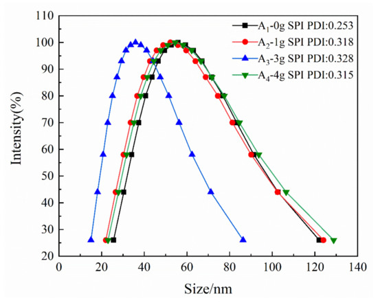 First, 1, 3, 4, and 6 g of soy protein isolate were mixed with 50 mL of an alkaline solution containing 0.2% NaOH by mass, followed by stirring at 95 °C for 60 min to prepare an SPI alkaline suspension. Next, 0.1 g of sodium metabisulfite was added to the suspension and stirred at 85 °C for 120 min to break the secondary and quaternary structures of the SPI to obtain a stable SPI hydrosol. Finally, 0.5 g of SDS was added to the hydrosol to prevent demulsification during the graft copolymerization.
