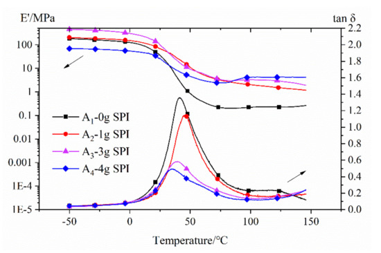 Storage modulus (E’) and the damping coefficient (tanδ) of the films. (Note: the film fabricated with 6 g of SPI was too brittle to be tested using dynamical mechanical analysis (DMA)).