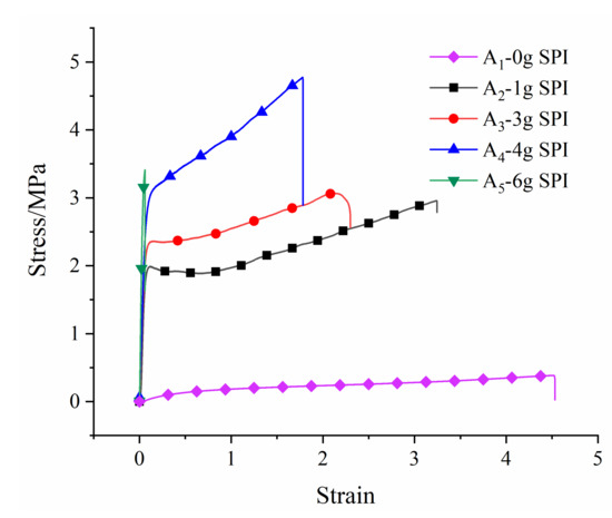 The stress–strain curves of the copolymer and mechanical properties are shown in Figure 6. With the increase in the SPI content, the strain decreased, and the elastic modulus increased. Table 4 shows the data for the tensile tests of the films. The results show that as the soy protein fraction in copolymer increased from 0% to 11.38%, the Young’s modulus of the film increased, the elongation at break decreased, and the tensile strength increased first and then decreased. When the soy protein content reached 11.38%, the tensile strength reached 102.343 MPa, but the elongation at break was only 21.416%, and the film was brittle. When the soy protein content reached 7.28%, the elastic modulus, tensile strength, and elongation at break were 46.949 MPa, 4.775 MPa, and 187.125%, respectively, which had better toughness. In general, the soy protein content had a significant effect on the mechanical properties of the film. Furthermore, the wear resistance and scratch resistance of the coating were also improved.