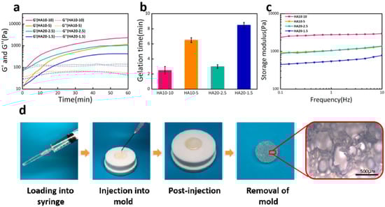 (a) Storage modulus (G’) and loss modulus (G’’) as a function of time for various hydrogels at 37 °C and 1 rad/s. (b) Gelation time of the hydrogels. HA20-1.5 had the longest gelation time about 8.5 min, whereas the gelation time of HA10-10 was much shorter about 2.5 min. (c) Frequency-dependent (at 37 °C and strain of 1%) oscillatory rheological analysis results. (d) A demonstration of the injectability and moldability of HA10-10.
