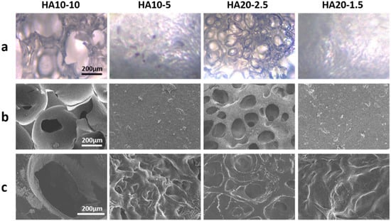 In addition, the microscopic morphology of the lyophilized hydrogel was observed by the scanning electron microscope. Similarly to the images of inverted fluorescence microscope and cryo-scanning electron microscope, HA10-10 and HA20-2.5 had obvious micron-sized porous structures, and the pore size of HA10-10 was larger than that of HA20-2.5. Compared to the cryo-scanning electron microscope images of the hydrogels without lyophilization, the surfaces of HA10-5 and HA20-1.5 became uneven after lyophilization (Figure 2c).