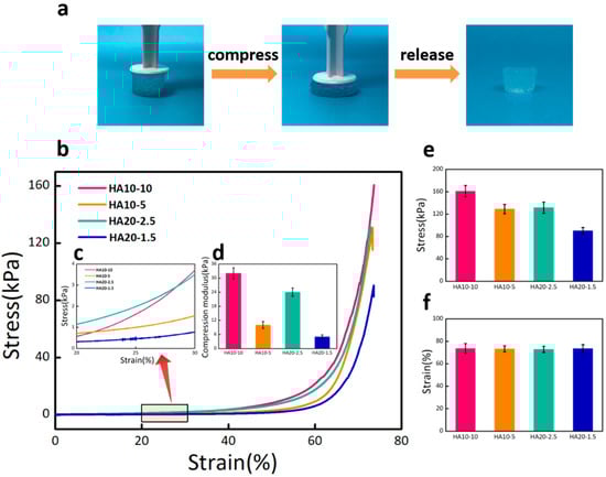 (a) Optical images of the hydrogel under excessive compression. (b) Stress–strain curves of HA10-10, HA10-5, HA20-2.5, and HA20-1.5 hydrogels under compression. (c) An elastic interval with the strain range of 20–30%. (d) Compression moduli of the hydrogels calculated from the stress–strain curve. (e) Compression stress and (f) compression strain of the hydrogels. HA10-10 had the largest compression stress about 160 kPa. There was no significant difference in compression strain of the four groups of hydrogels.