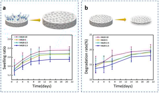 Hydrogels are hydrophilic, and can swell to an equilibrium volume in water while still maintaining their shapes and three-dimensional spatial network structures. Figure 5a showed the swelling ratios of the four groups of hydrogels in PBS (pH = 7.4). HA10-10 had the highest swelling ratio, about 2.3, which shows that the swelling ratio was improved by the porous structure of the hydrogel. In porous hydrogels, the scale criteria that determine the swelling process are pore size and porosity. The porous structure can greatly increase the swelling ratio of the hydrogel [38]; therefore, HA10-10 and HA20-2.5 with obvious porous structures and higher porosity, had larger swelling ratios compared to HA10-5 and HA20-1.5. After 7 days, the swelling ratios of the four groups of hydrogels slowed down and reached swelling equilibrium at 21 days.