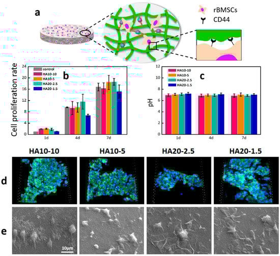 Cell adhesion, morphology, and proliferation of rBMSCs on the hydrogels. (a) A demonstration of rBMSCs adhesion on the surface of a HA hydrogel. (b) The cell proliferation on the hydrogels after culturing for 1, 4, and 7 days was further determined by Alamar Blue detection reagents; (c) pHs of PBS soaked in the hydrogels; (d) fluorescent images of cell adhesion on the hydrogels by confocal microscope with FITC and DAPI staining after 24 h (scanning box: 212 × 212 × 36 μm3). (e) Cell morphologies of the hydrogels after 24 h.