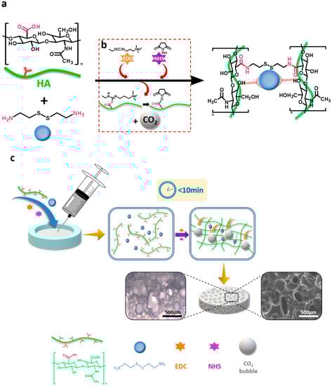 Schematic illustration of the fabrication of the injectable, porous hydrogel based on the in-situ, bubble-forming hydrogel entrapment process. (a) An amide reaction between HA and cystamine dihydrochloride catalyzed by EDC and NHS. Cystamine dihydrochloride was selected as a cross-linking agent to cross-link HA molecules by the reaction between carboxyl group and amino group; (b) EDC and NHS were used to activate the carboxyl group on HA, generating intermediate and CO2 bubbles; (c) HA hydrogel prepared in this study had a gelation time of less than 10 min. Due to the rapid gelation process, CO2 bubbles generated by EDC and NHS were entrapped in the 3D network, leaving a micron-sized porous structure inside the hydrogel.