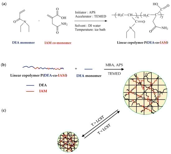 - Panayiotou, M.; Freitag, R. Synthesis and characterisation of stimuli-responsive poly(N,N’-diethyl-acrylamide) hydrogels. Polymer 2005, 46, 615–621. [Google Scholar] [CrossRef]