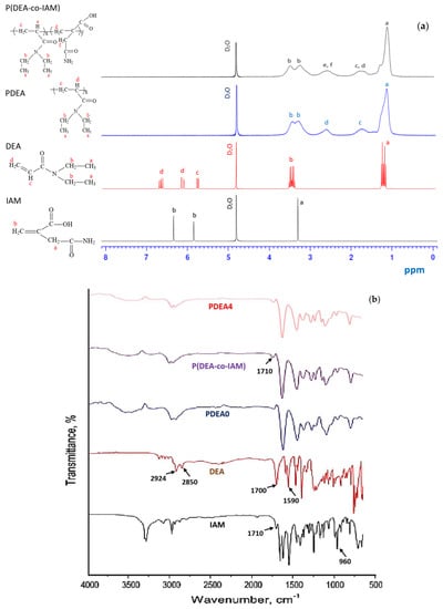 Figure 2a shows 1H NMR spectra of DEA monomer, IAM comonomer, linear homopolymer PDEA and linear copolymer P(DEA-co-IAM). The characteristic peaks from IAM were at δ = 3.3 ppm (–CH2–) and δ = 5.9–6.4 ppm (CH2=). The characteristic peaks from DEA were at δ = 0.9–1.4 ppm (–CH3, in ethyl group); δ = 3.3–3.5 ppm (–CH2–, in ethyl group); δ = 5.7 (=CH–) and δ = 6.1–6.7 ppm (CH2=). The peaks from DEA at δ = 5.7, 6.1 and 6.7 ppm and from IAM at δ = 5.9 and 6.4 ppm were absent in the spectra of PDEA and P(DEA-co-IAM) while the strong bands at 1.1 and 3.3 ppm correspond to CH3 and CH2 protons of ethyl groups in the side chain; the bands at 1.7 and 2.55 ppm correspond to CH2 and CH protons of the main chain appeared indicating successful synthesis of linear homopolymer PDEA and copolymer P(DEA-co-IAM) [,,].
