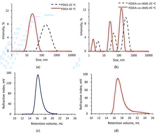 DLS of (a) linear homopolymer PDEA and (b) linear copolymer P(DEA-co-IAM) at 25 (below LCST) and 45 °C (above LCST); (c) GPC trace of linear homopolymer PDEA and (d) linear copolymer P(DEA-co-IAM).