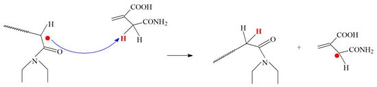 Gel permeation chromatography (GPC) was used to investigate the influence of IAM monomer to the number average molecular weight (Mn) and polydispersity index (PDI) of linear polymers. Figure 3c,d show the GPC curves of the homopolymer PDEA and linear copolymer P(DEA-co-IAM), respectively, while their Mn and PDI are shown in Table 2. The PDI was rather narrow with the value of 1.68 and not significantly affected by IAM monomer. The Mn of P(DEA-co-IAM) (5.80 × 104 g/mol) was lower than PDEA (11.5 × 104 g/mol). It may be the influence of methanediyl group (–CH2–) from IAM composition units. In the propagation of free radical polymerization, the unpaired electron at the end of a growing chain could be paired with an electron of carbon-hydrogen bond from methanediyl group of IAM leading to the chain termination occurred quickly. This process is illustrated in the Figure 4. Besides, the GPC curve of linear copolymer P(DEA-co-IAM) showed one size distribution, while the DLS results presented a polydisperse with three peaks. The main factor explaining this difference could be temperature. As mentioned above, the hydrodynamic radii of linear polymers were measured at 25 and 45 °C, while the molecular weights were confirmed at 60 °C. At high temperatures, the ionization of the IAM segments within linear copolymer P(DEA-co-IAM) took place stronger, so the oligomers could be aggregated together more easily to form the larger globules.