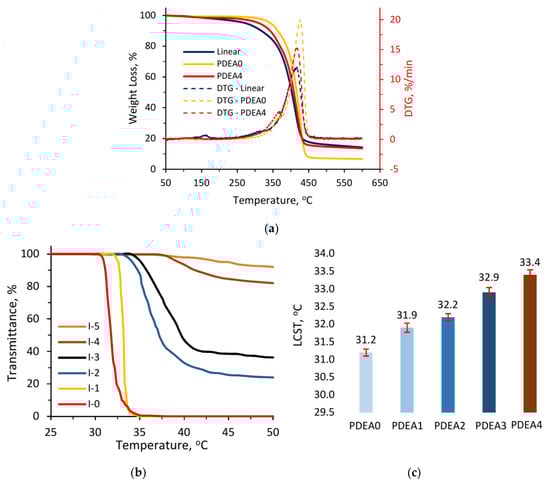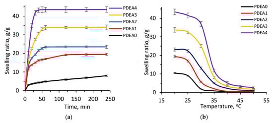 The swelling behavior in DI water at different temperatures was tested to demonstrate the thermo-sensitive property of the obtained hydrogels and the results are shown in Figure 9b. As clearly described, at the same temperature, the equilibrium-swelling ratio of the hydrogels increased from PDEA0 to PDEA4 samples, due to the high hydrophilicity of IAM co-monomer. For example, at 20 °C PDEA0 had the highest swelling ratio of 10.52 g/g, while these values for PDEA1, PDEA2, PDEA3 and PDEA4 samples were 19.55, 23.19, 33.78 and 43.44 g/g, respectively. In the temperature range of 30 to 35 °C, the swelling ratios decreased dramatically. This result is consistent with LCST values as shown in Figure 5c. Generally, the thermo-responsive semi-IPN hydrogel was shrunken at above LCST and swollen at below LCST because it passed through the coil-to-globule transition [], and was illustrated in Figure 1c. In comparison with other semi-IPN hydrogels based on DEA, such as Chen et al. [], Wei et al. [] and Zhang et al. [], IAM in this work exhibited the remarkable hydrophilicity with the swelling ratio of 43.43 g/g. Moreover, Figure 9b also shows no significant difference in the swelling ratios of the hydrogels at the temperatures above LCST. This can be explained by the collapse of semi-IPN hydrogels to form the same network structures at high temperatures.