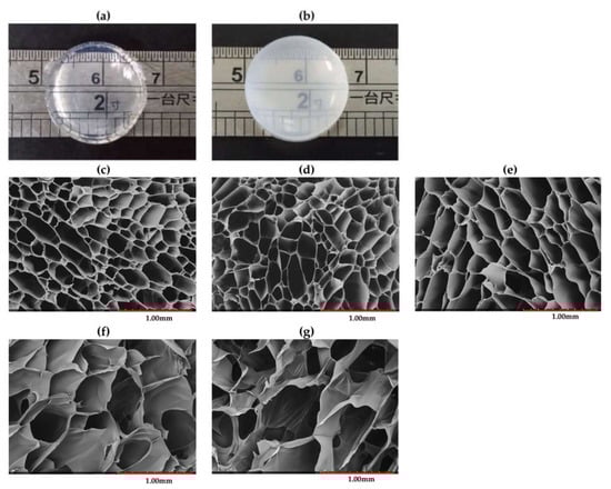 Photograph (a–b) and SEM images (c–g) of conventional PDEA and semi–IPN hydrogels: (a) PDEA0, (b) PDEA2, (c) PDEA0, (d) PDEA1, (e) PDEA2, (f) PDEA3 and (g) PDEA4.