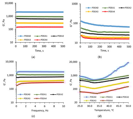 The influence of temperature on G’ values is shown in Figure 7d. As can be observed, all the hydrogels exhibited the same rheological behavior with temperature. The G’ values decreased slightly in the temperature range of 25–33 °C, while they increased continuously at temperature above 33 °C. Again, these results strongly confirmed the thermal sensitivity of the obtained hydrogels. At below LCST, the oscillation of linear copolymers was increased with increasing temperature, resulting increased flexibility of the overall hydrogel network and reduced the elastic modulus. On the contrary, at above LCST, the absorbed water was expelled from the polymer network due to poor interaction between PDEA and water. Therefore, the crosslinking density increased as well as G’ values increased.