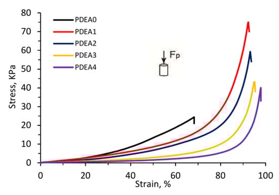 Figure 8 shows the stress–strain curves, while the compressive modulus, fracture strain and fracture stress of the hydrogels are listed in Table 3. The semi-IPN hydrogels had lower compressive modulus compared with the PDEA conventional hydrogel. As shown in the Table 1, from PDEA0 to PDEA4 samples, the PDEA content decreased leading to decrease the crosslinking density and hardness of hydrogels, then decreased compressive modulus. Besides, the fracture stress of semi-IPN hydrogels increased significantly compared with that of conventional one. This phenomenon can be explained by the fact that the linear copolymer chains P(DEA-co-IAM) within semi-IPN hydrogel acted as a stress-dispersing agent and subjected to higher stress. Similar result was reported by Liu et al. for poly(N-isopropylacrylamide-co-hydroxyethyl methacrylate)/poly(N-isopropylacrylamide) semi-IPN hydrogels []. For semi-IPN hydrogels, from PDEA1 to PDEA4 samples, the fracture stress was gradually decreased which was ascribed to the difference of pore sizes. It was reported that the hydrogels with small pore sizes prevented the crack propagation when they were subjected to external forces because of the low stress concentration []. Figure 6c–g and Table 3 show PDEA4 sample possessed the biggest pore size and lowest fracture stress. Generally, the stress distribution took place faster and easier in the smaller pore size hydrogel networks. Similar results were found in many semi-IPN hydrogel systems [,,,].