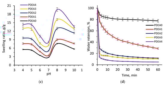 Figure 9a shows the swelling kinetic curves of the dried hydrogels with different feeding ratios in DI water at 20 °C. It was clearly seen that the semi-IPN hydrogels had a faster swelling rate and higher equilibrium-swelling ratio than the conventional hydrogel, and these values were gradually increased as the linear copolymer content increased. For example, the swelling ratio of PDEA0 sample was about 3.60 g/g within 20 min, about 4.89 g/g within 60 min, while this value of PDEA1, PDEA2, PDEA3 and PDEA4 samples were about 13.69, 17.15, 22.25 and 35.08 g/g within 20 min, and about 16.79, 23.03, 33.42 and 43.65 g/g within 60 min, respectively. This result can be attributed by the hydrophilicity of linear copolymer originating from IAM units as discussed above. Besides, it was also believed that the high molecular weight chains of linear copolymer acted as channels for moving water in semi-IPN hydrogel structure [,]. Thus, it could assist water molecules move easily from outside into the hydrogel network, leading to increase the swelling rate. On the other hand, it was reported that the swelling kinetic was influenced by the crosslinking density of the polymer networks []. In this work, from PDEA0 to PDEA4 sample, the crosslinking density gradually decrease makes PDEA4 sample had the largest pore size, highest swelling rate and highest swelling ratio. This result demonstrated that the swelling kinetics of semi-IPN hydrogels could be controlled by changing the linear copolymer content.