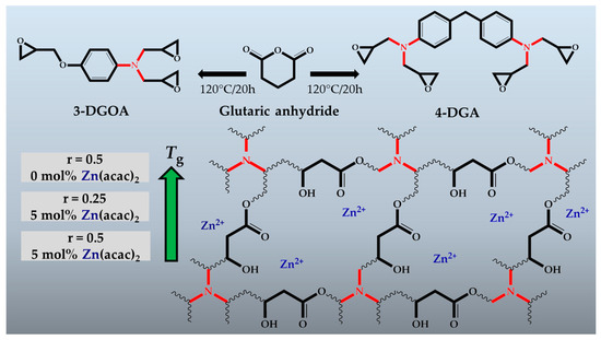 N,N-diglycidyl-4-glycidyloxyaniline, 4,4′-methylenbis(N,N-diglycidylaniline), zinc(II)- acetylacetonate hydrate and glutaric anhydride (95%) were purchased from Sigma Aldrich (St. Lois, MO, USA). The chemicals were used as received. For preparative work, hazardous chemicals and solvents were employed. Reactions must be carried out in a fume hood, and protective clothes and goggles must be used.