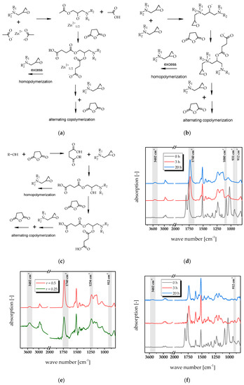 The fast curing can be explained by the catalytic effect of Zn(acac)2−H2O. It is well known that organic zinc salts take part in the curing reaction due to their nucleophilic nature [29,30]. By dissolving the zinc salt in the epoxy monomers, the Zn2+ ions are able to substitute the organic ligands with the oxygen of the epoxide ring. Subsequently, ring opening of the epoxide groups takes place, and after adding the anhydride, carboxylate-ions are formed (Figure 2a), which undergo a nucleophilic ring-opening reaction with the epoxy moieties. Ester groups and additional carboxylate anions are formed, which leads to a perpetuation of the ring-opening reaction. The reaction follows an anionic alternating copolymerization, yielding a polyester network. The ligands typically evaporate during solvation and curing and the Zn2+ ions remain in the cured network. In addition, water is released from the catalyst at high temperature, which further accelerates the reaction by hydrolysing the anhydride ring under the formation of carboxylic acids. Furthermore, it should be noted that a homopolymerisation of the epoxy groups can take place as an alternative reaction pathway at an excess of epoxy monomers and at low curing temperatures [27]. At 1080 cm−1, a small band is observed, which might be related to the C–O absorption band of ethers [31]. However, the competition between esterification and etherification cannot be clearly identified since C–O bands of the ester moieties at 1250 cm−1 overlap with ether bands (1200–1080 cm−1) in the fingerprint area.