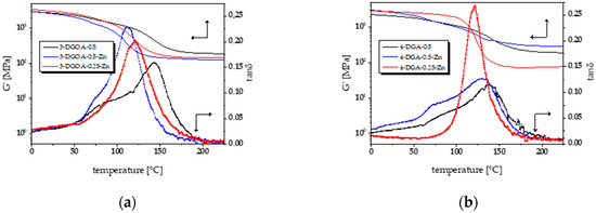 A comparable behaviour and shift in the maximum tan δ values is also observed in the DMTA curves of non-catalysed 4-DGA networks (Figure 3b). However, an onset of a sub-glass transition is observed at around 20 °C, which indicates an incompletely cured network. 4-DGA-0.5-Zn systems follow the same trend giving rise to an incomplete homopolymerisation of the epoxy monomers. This is also corroborated by FT-IR data showing a lower number of –OH groups and a higher content of non-reacted epoxy moieties.